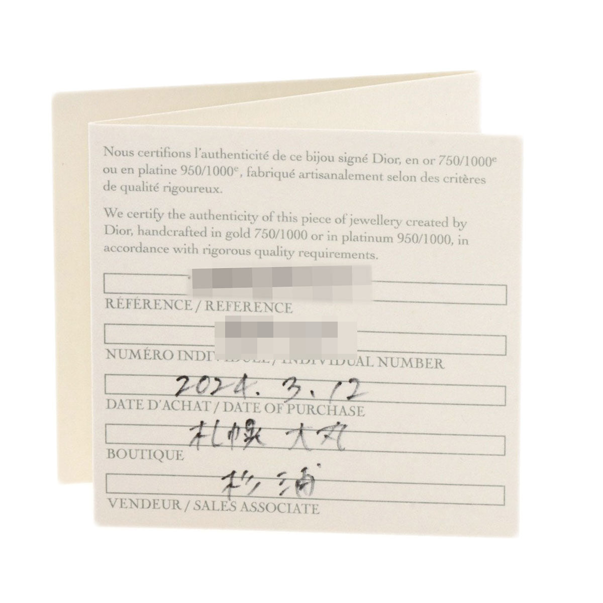 | Accessories | Dior warranty card and box |