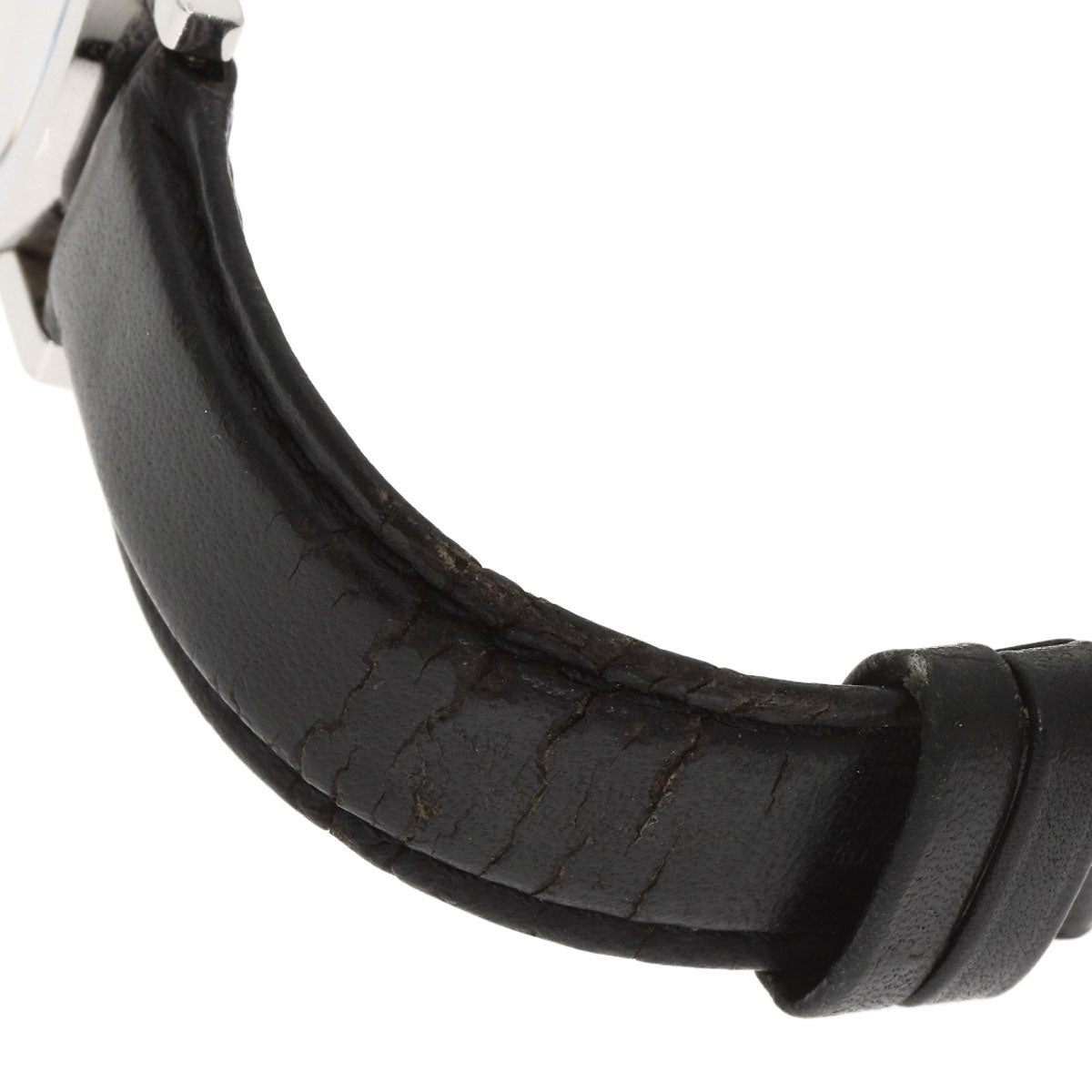 There are scratches and stains all over the watch, and the leather strap shows signs of wear.